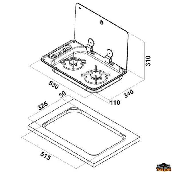 Paslanmaz çelikten yapılmış dikdörtgen gömme ocak, 2 brülor gaz kaynağı, titreşim önleyici rondelalarla sabitlenmiş paslanmaz çelik destek ızgarası mevcuttur. Gizli menteşeli temperli siyah cam kapak.