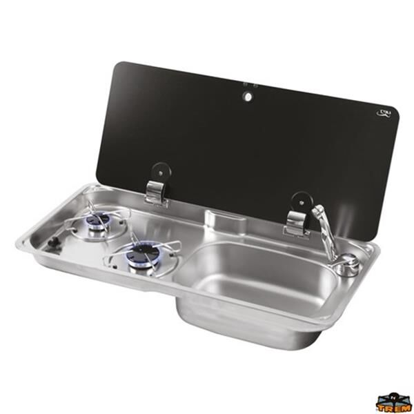 Paslanmaz çelikten yapılmış, 2 brülörlü gaz beslemesi, sağda dikdörtgen lavabo ile donatılmış, titreşim önleyici rondelalarla sabitlenmiş paslanmaz çelik destek ızgarası. Gizli menteşeli temperli siyah cam kapak. Musluk ve su gideri ayrıca sipariş edilmelidir.