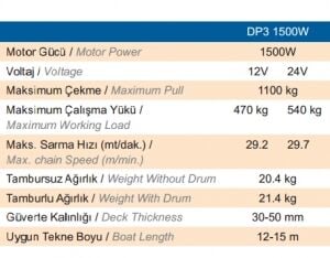 Deniz koşullarına tamamen uyumlu AISI 316 paslanmaz çelik, alüminyum, kromaj ve kompozit malzemelerden mamuldür. Üstün kalitesi ve mükemmel dizaynı ile uzun süre servis gereksinimi duymayacak şekilde tasarlanmıştır. CE onaylıdır. Opsiyonel zincir sayacı bağlantısı için gerekli sensör ırgat üzerine standart olarak monte edilmiştir. Solenoid ve vinç kolu standart ekipmanlardır.