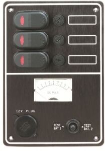 Üçlü sigorta paneli, çakmak soketli ve voltmetreli. 190x133 mm siyah alüminyum panel.