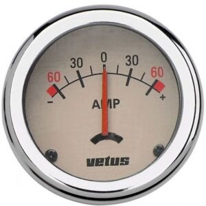 Vetus ampermetre. 12/24V. +/-60 amper izlenebilir. Ø 52 mm. Kromaj ve siyah olamak üzere iki adet çerçeve standarttır. İhtiyaca göre çerçevelerden herhangi birini kullanabilirsiniz.Kadran Krem