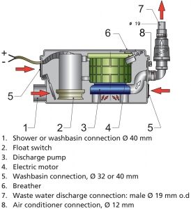 VETUS gri su tahliye sistemi ile suyun duş teknesi veya lavabodan otomatik olarak atık su tankına basılması mümkündür. Düşük gürültülü tahliye pompası, otomatik flatör ve tahliye hattında çek valf ile su geçirmez bir muhafazaya sahiptir. Suyu ana tanka kolayca pompalayabilirsiniz.