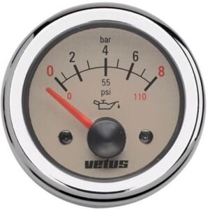 Vetus yağ basınç göstergesi. 0-8 Bar (0-110 PSI) Ø 52mm. Siyah ve kromaj iki adet çerçeve standarttır. İhtiyaca göre çerçevelerden herhangi biri kullanılabilir.Tip Krem kadranlı